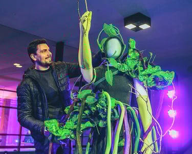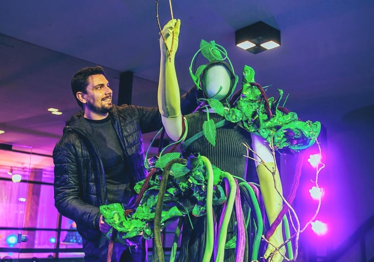 O artista visual Gustavo Krelling com um dos figurinos da exposição “Caminhos do Encantamento”, feitos com materiais de reúso. A mostra, que propõe uma imersão no universo dos contos de fadas, está aberta ao público até o dia 20, na Biblioteca Pública do Paraná, em Curitiba.